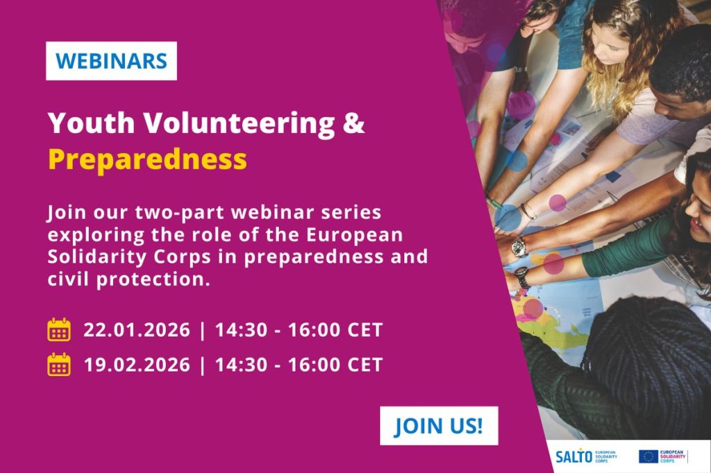 Preparedness and resilience are now key EU priorities and youth volunteering (including the European Solidarity Corps) can help strengthen preparedness at community level, without becoming an emergency response. SALTO European Solidarity Corps is hosting two interconnected webinars: 22 Jan 2026 – 14:30 – 16:00 CET – Webinar 1 “The contribution of youth volunteering to Resilience […]